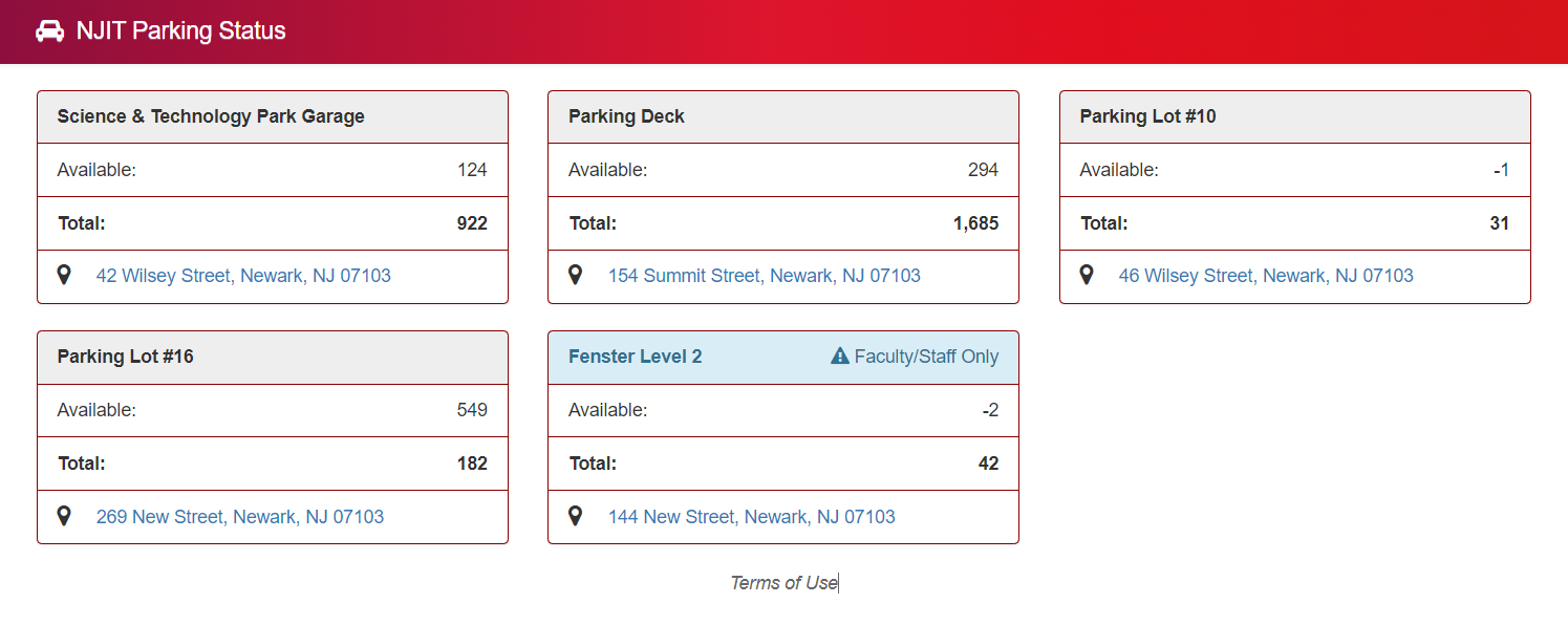 The current parking system NJIT has. As seen in the picture, it is really simple, only showing three information: the location, available spots, and total spots. But the availability is always incorrect, as seen in the picture, where there are negative spots.